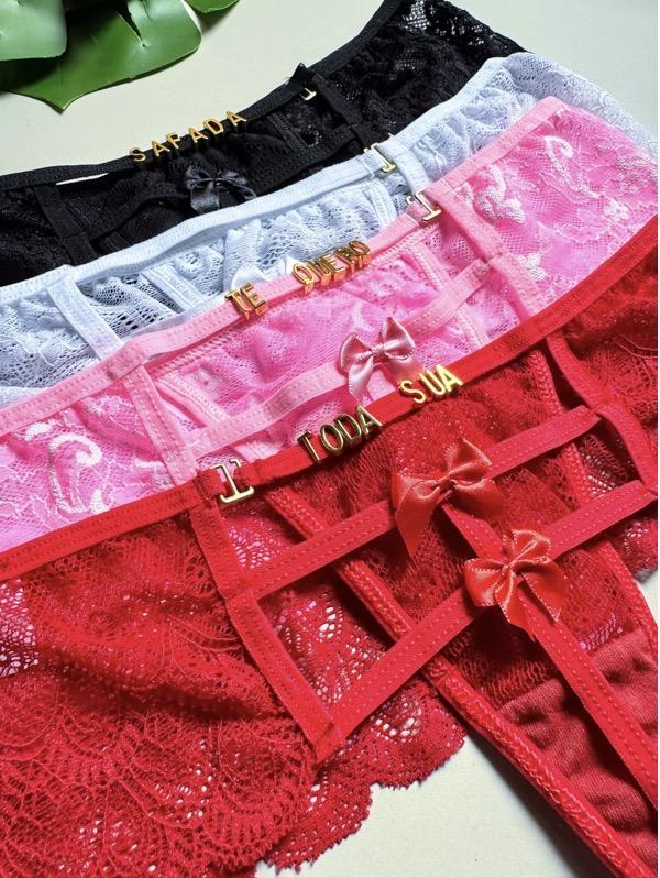 Calcinha fio confeccionada em renda, com alça personalizável para letras e fundo forrado em algodão.